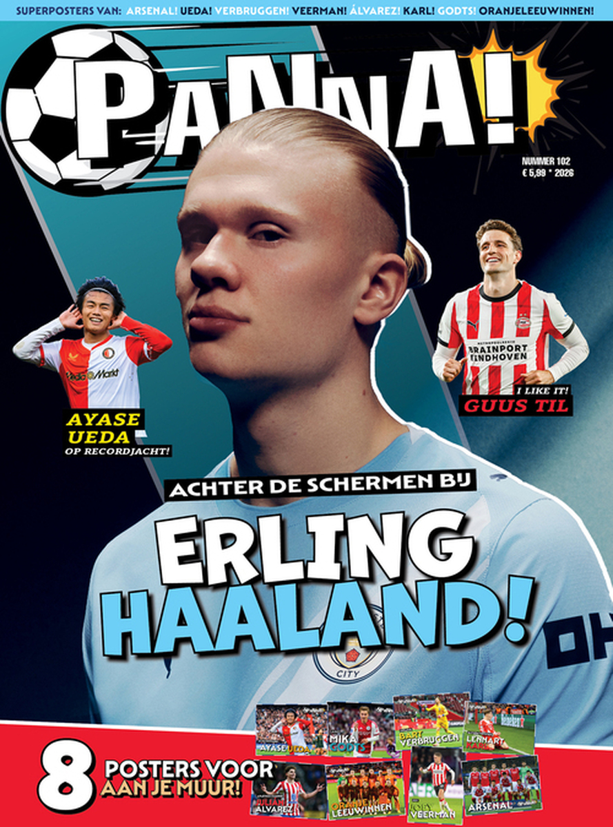 Een scoringsmachine, een doelpuntenkanon, een enorme goaltjesdief. Alle termen kunnen geplakt worden op Erling Haaland. Tegenwoordig is de Noorse krachtpatser van Manchester City ook vlogger. De centrumspits siert de cover van de nieuwe PANNA! Nummer 102, de eerste van 2026, staat weer vol leuke verhalen. Interviews met Donyell Malen en Pascal Struijk, de mythe van Ajax, Guus Til ontleed en Ayase Ueda op topscorerspad. En zoals vertrouwd weer acht superposters!